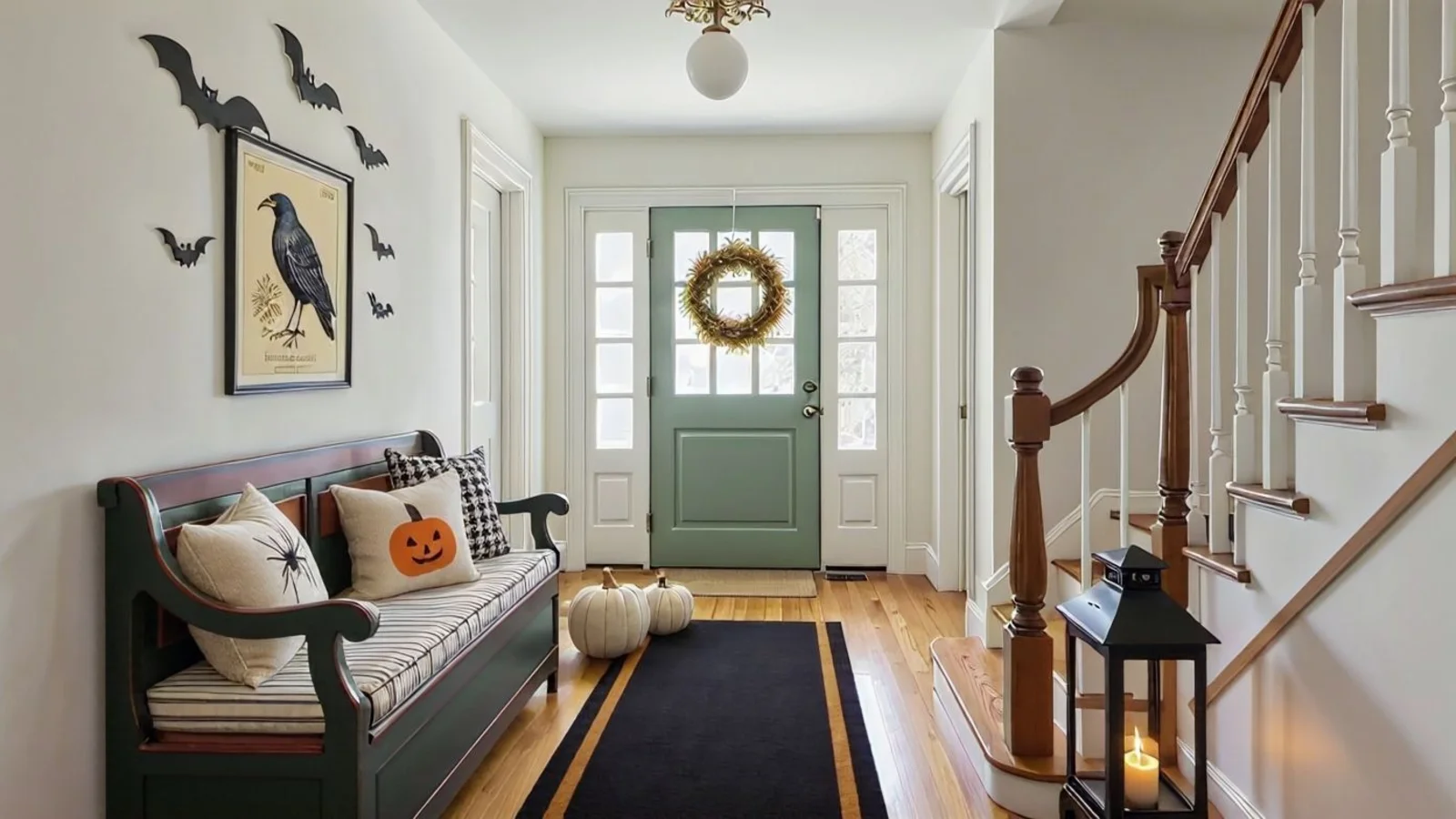 "Change the room to Halloween theme and add a Halloween pumpkin on the porch."