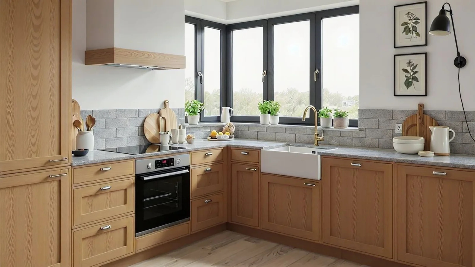 Use precise material names such as matte white, oak wood, marble, granite, etc.