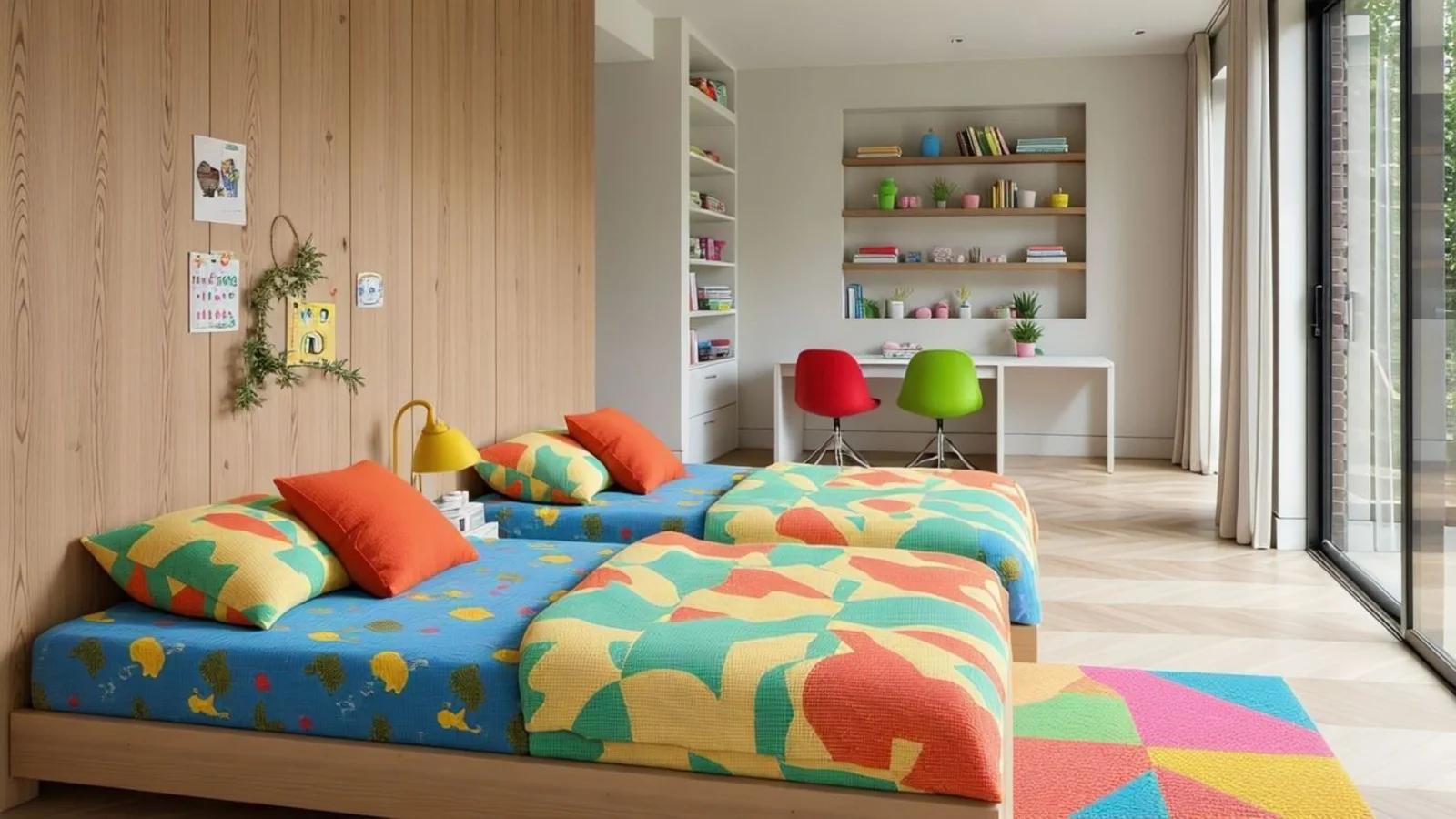 "Convert the small room into a kids' study area with a study table and chair."